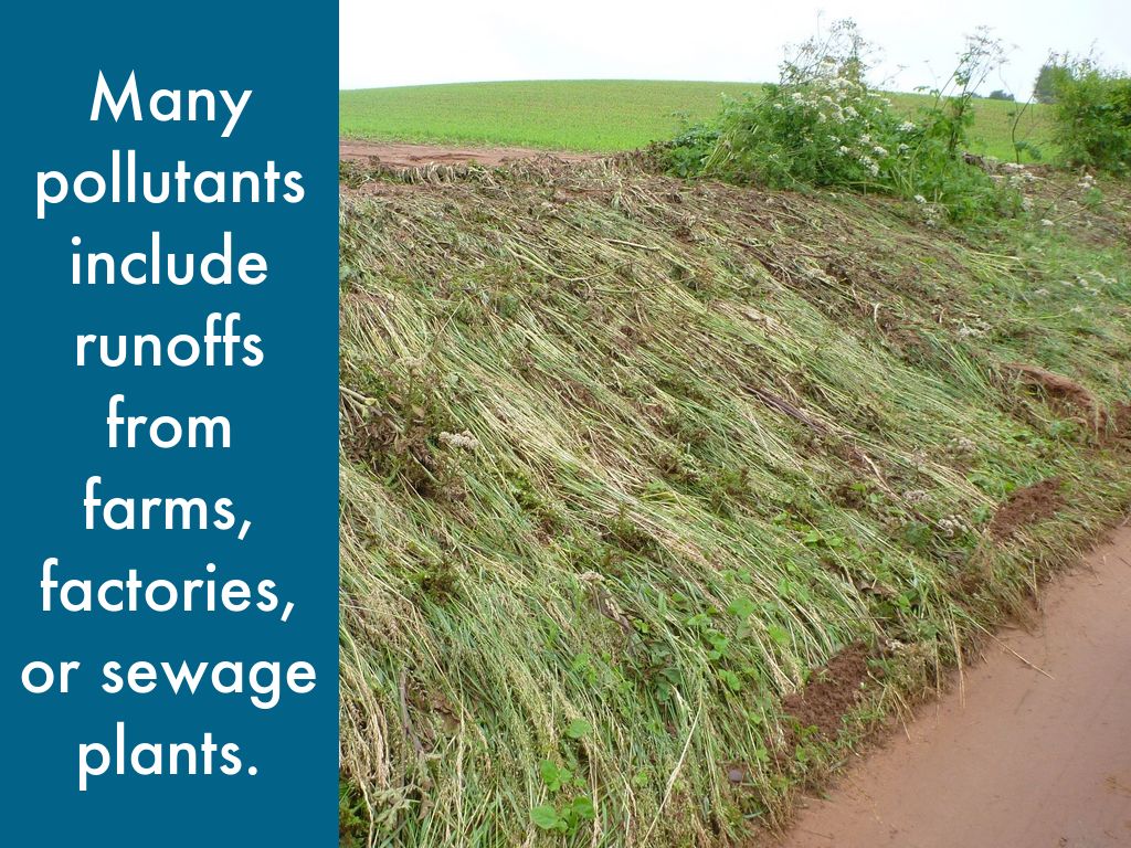 Many pollutants include runoffs from farms, factories, or sewage plants.