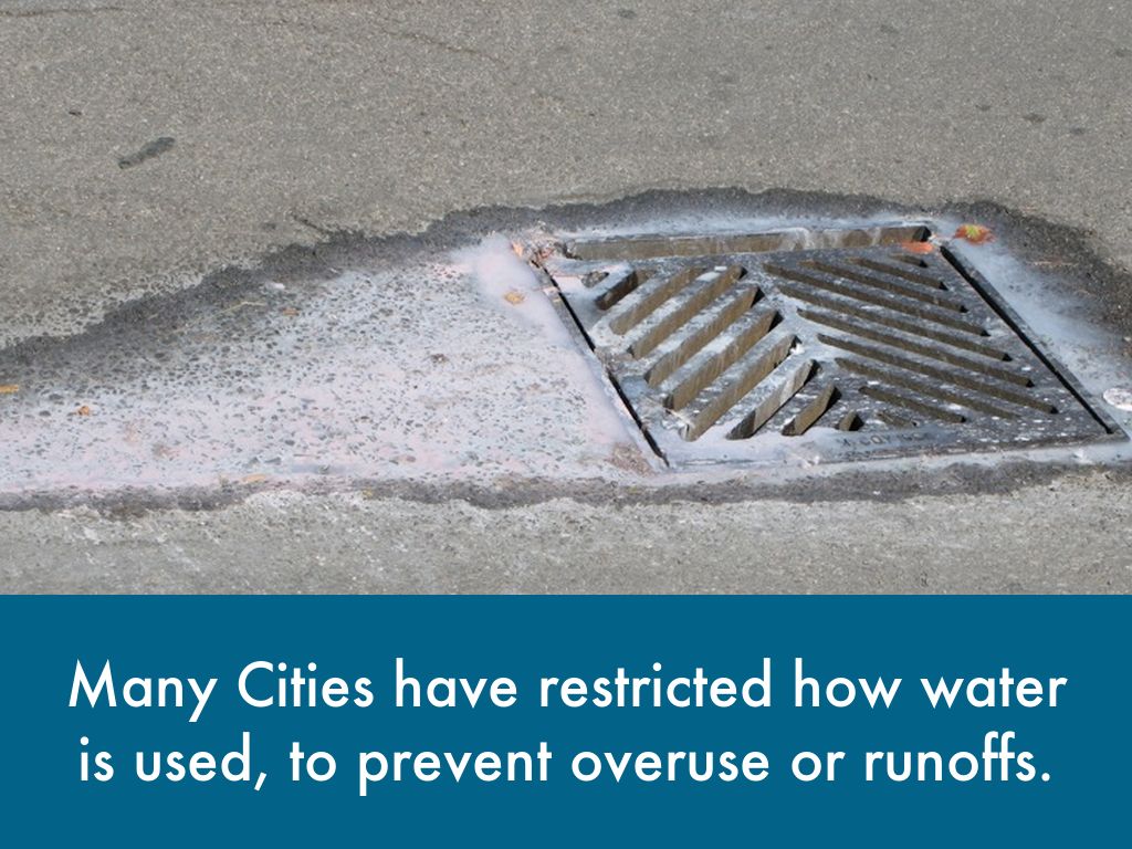 Many Cities have restricted how water is used, to prevent overuse or runoffs.