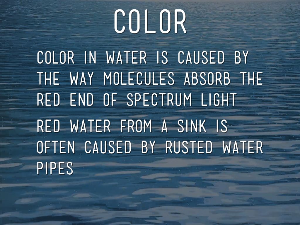 Color in water is caused by the way molecules absorb the red end of spectrum light