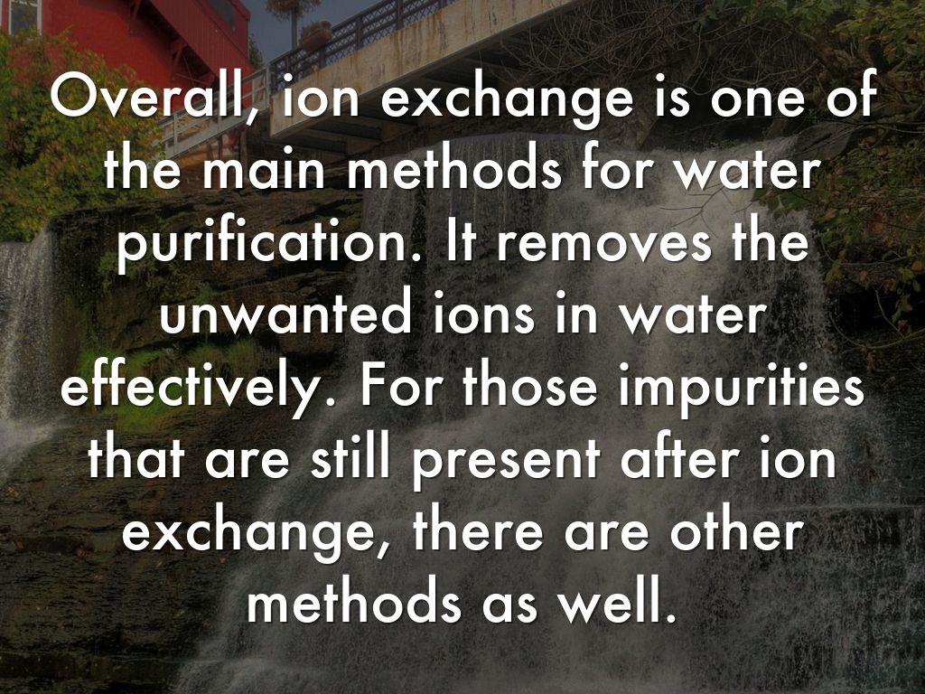 Overall, ion exchange is one of the main methods for water purification. It removes the unwanted ions in water effectively. For those impurities that are still present after ion exchange, there are other methods as well.