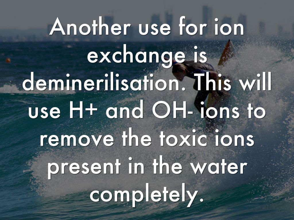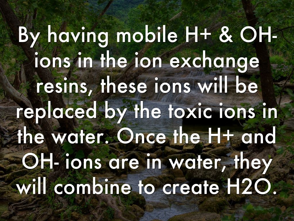 By having mobile H+ & OH- ions in the ion exchange resins, these ions will be replaced by the toxic ions in the water. Once the H+ and OH- ions are in water, they will combine to create H2O.