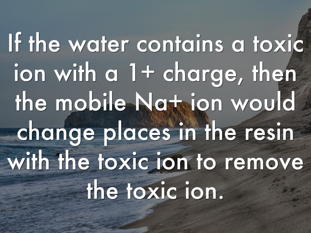 If the water contains a toxic ion with a 1+ charge, then the mobile Na+ ion would change places in the resin with the toxic ion to remove the toxic ion.