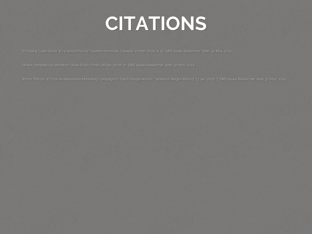 • "Providing Clean Water: It's a World Priority." Gazette (Montreal, Canada). 22 Mar. 2009: A. 16. SIRS Issues Researcher. Web. 30 May. 2014.