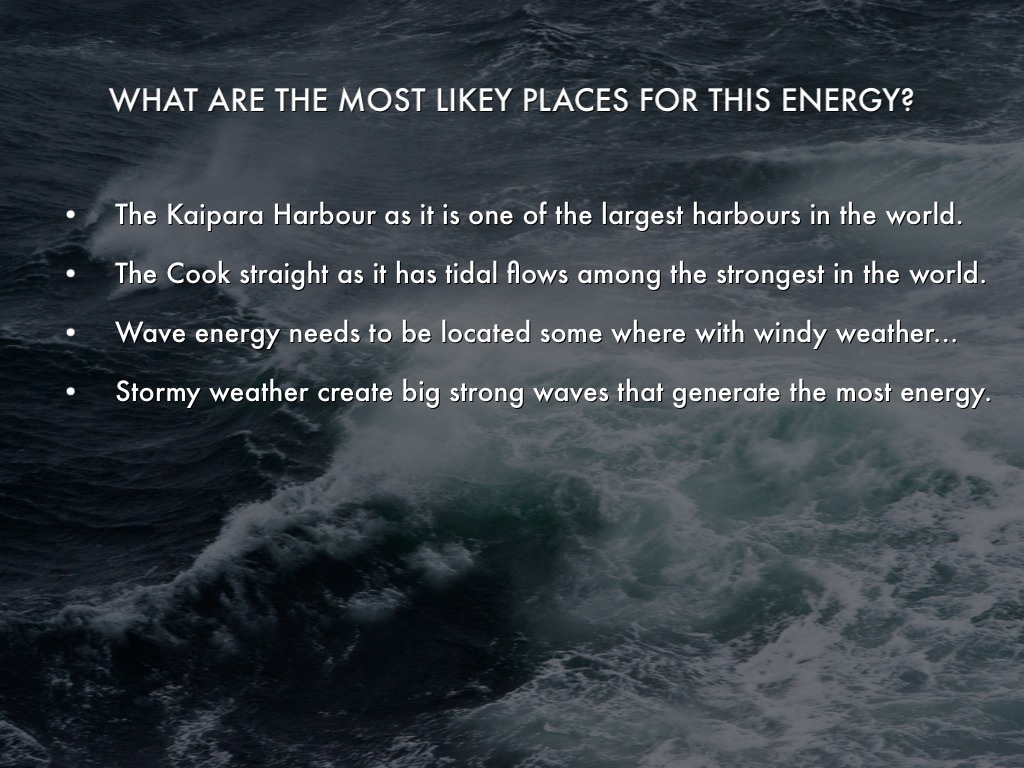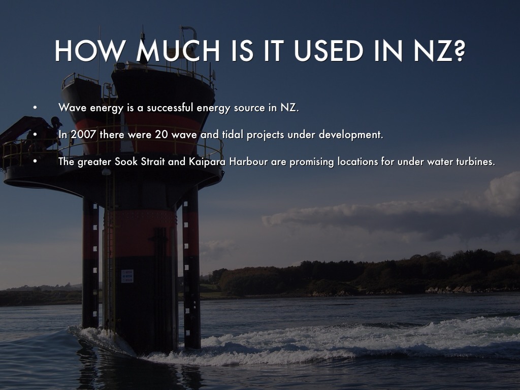 The greater Sook Strait and Kaipara Harbour are promising locations for under water turbines.