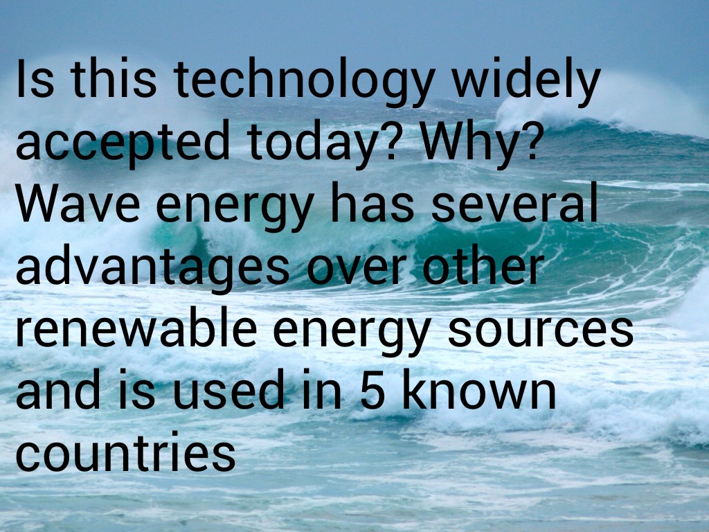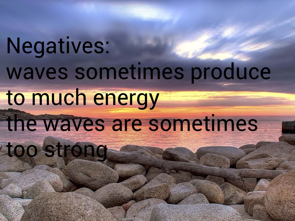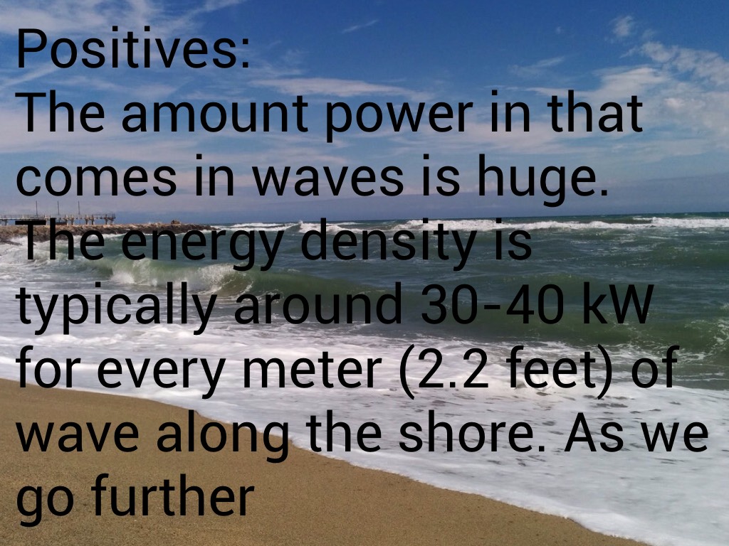 Positives: The amount power in that comes in waves is huge. The energy density is typically around 30-40 kW for every meter (2.2 feet) of wave along the shore. As we go further