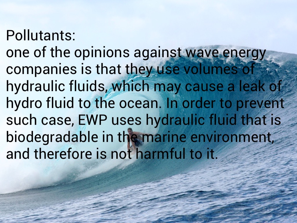 Pollutants: one of the opinions against wave energy companies is that they use volumes of hydraulic fluids, which may cause a leak of hydro fluid to the ocean. In order to prevent such case, EWP uses hydraulic fluid that is biodegradable in the marine environment, and therefore is not harmful to it.