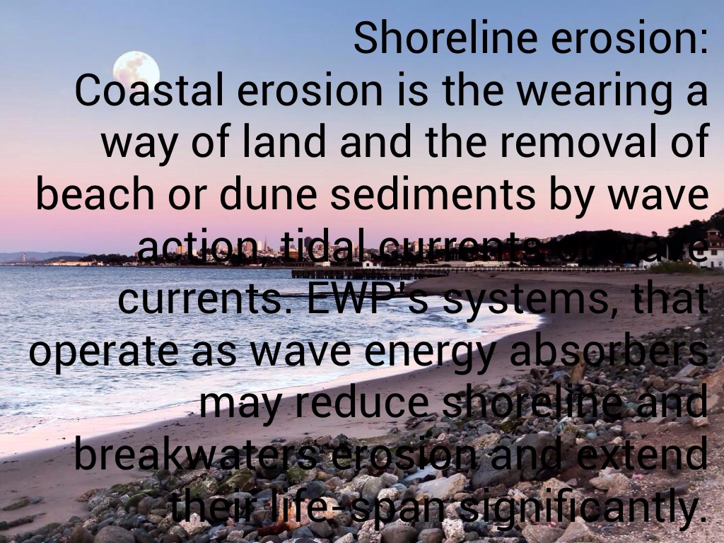 Shoreline erosion: Coastal erosion is the wearing a way of land and the removal of beach or dune sediments by wave action, tidal currents or wave currents. EWP’s systems, that operate as wave energy absorbers may reduce shoreline and breakwaters erosion and extend their life-span significantly.