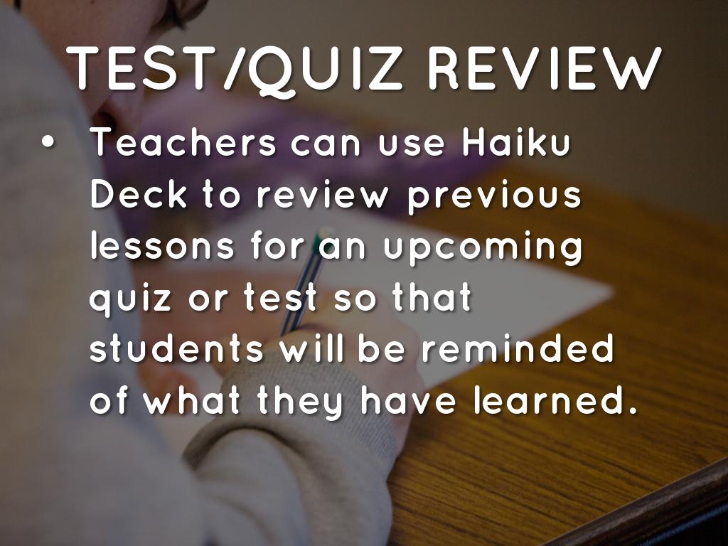 Teachers can use Haiku Deck to review previous lessons for an upcoming quiz or test so that students will be reminded of what they have learned.