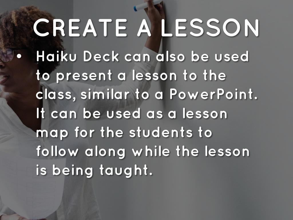 Haiku Deck can also be used to present a lesson to the class, similar to a PowerPoint. It can be used as a lesson map for the students to follow along while the lesson is being taught.