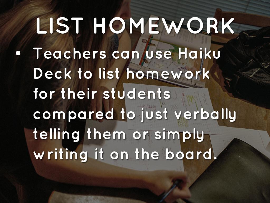Teachers can use Haiku Deck to list homework for their students compared to just verbally telling them or simply writing it on the board.