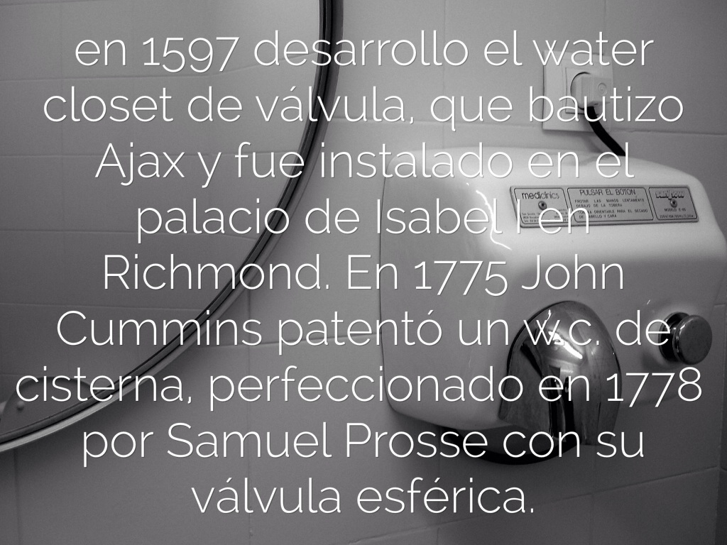 en 1597 desarrollo el water closet de válvula, que bautizo Ajax y fue instalado en el palacio de Isabel I en Richmond. En 1775 John Cummins patentó un w.c. de cisterna, perfeccionado en 1778 por Samuel Prosse con su válvula esférica.