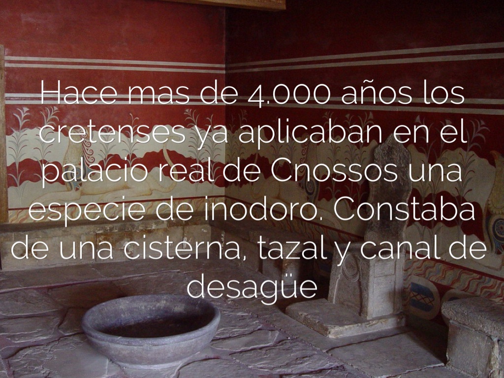 Hace mas de 4.000 años los cretenses ya aplicaban en el palacio real de Cnossos una especie de inodoro. Constaba de una cisterna, tazal y canal de desagüe