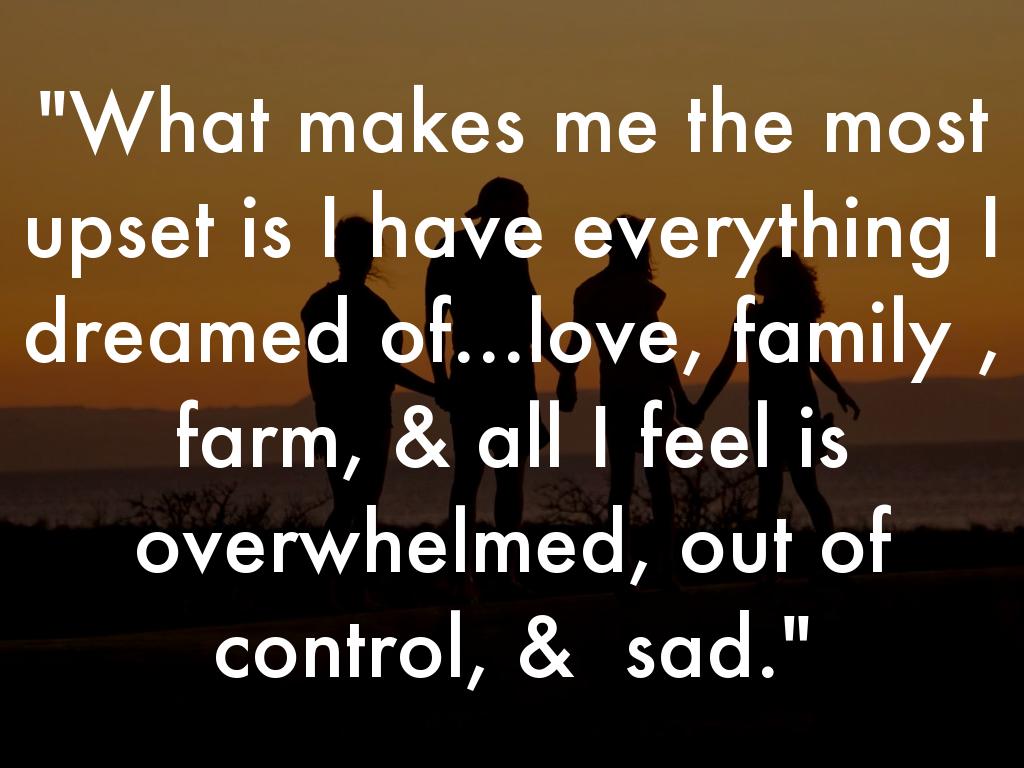 "What makes me the most upset is I have everything I dreamed of...love, family , farm, & all I feel is overwhelmed, out of control, & sad."
