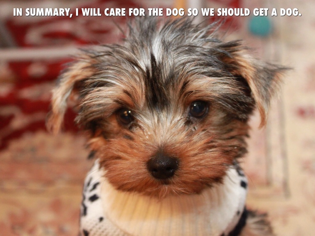 IN SUMMARY, I WILL CARE FOR THE DOG SO WE SHOULD GET A DOG.