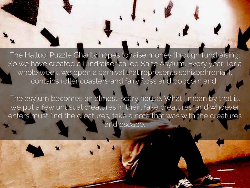 The Halluci Puzzle Charity hopes to raise money through fundraising. So we have created a fundraiser called Sane Asylum. Every year, for a whole week, we open a carnival that represents schizophrenia. It contains roller coasters and fairy floss and popcorn and..