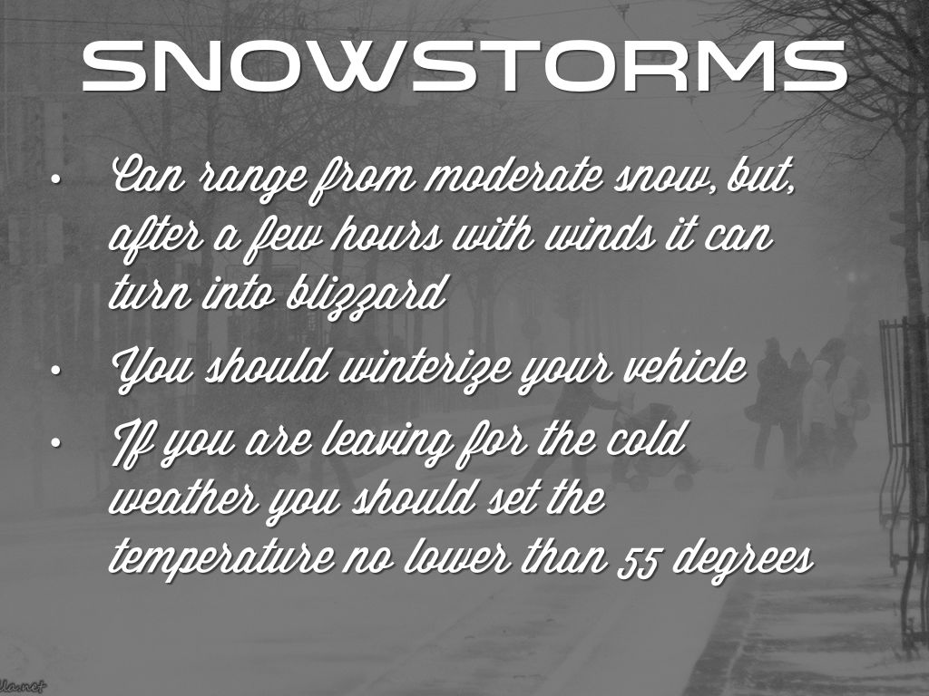 • Can range from moderate snow, but, after a few hours with winds it can turn into blizzard