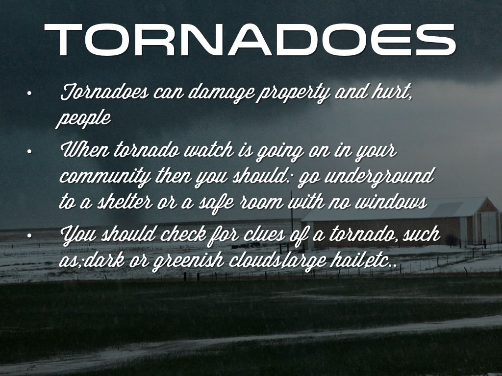 • You should check for clues of a tornado, such as;dark or greenish clouds,large hail,etc..