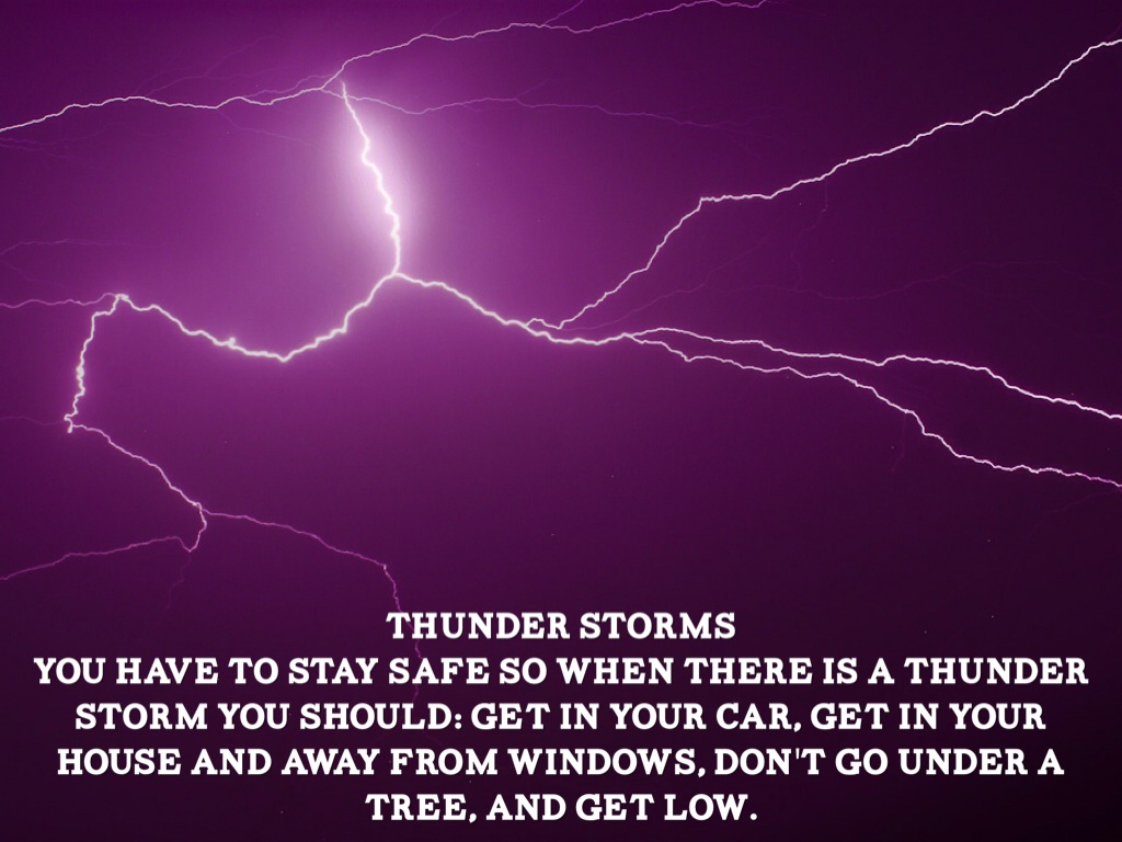 Thunder storms You have to stay safe so when there is a thunder storm you should: get in your car, get in your house and away from windows, don't go under a tree, and get low.