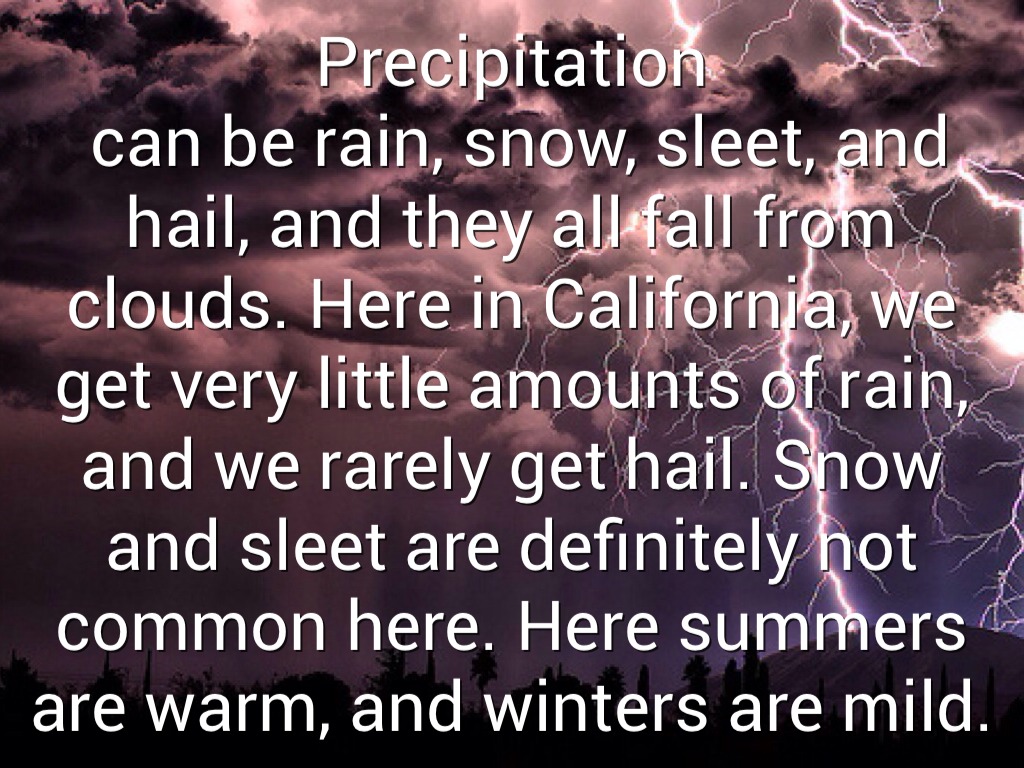 can be rain, snow, sleet, and hail, and they all fall from clouds. Here in California, we get very little amounts of rain, and we rarely get hail. Snow and sleet are definitely not common here. Here summers are warm, and winters are mild.