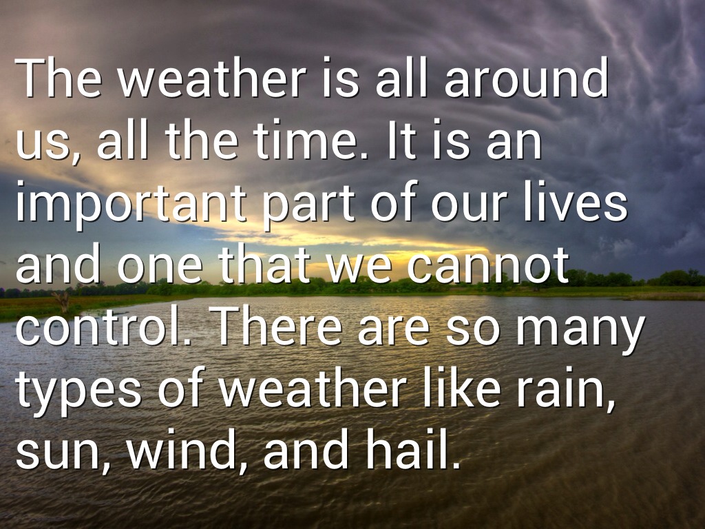 The weather is all around us, all the time. It is an important part of our lives and one that we cannot control. There are so many types of weather like rain, sun, wind, and hail.