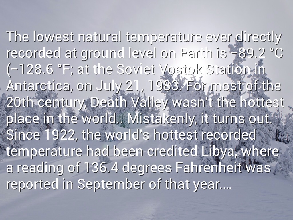 The lowest natural temperature ever directly recorded at ground level on Earth is −89.2 °C (−128.6 °F; at the Soviet Vostok Station in Antarctica, on July 21, 1983. For most of the 20th century, Death Valley wasn't the hottest place in the world.. Mistakenly, it turns out. Since 1922, the world's hottest recorded temperature had been credited Libya, where a reading of 136.4 degrees Fahrenheit was reported in September of that year.