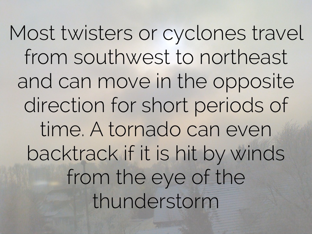 Most twisters or cyclones travel from southwest to northeast and can move in the opposite direction for short periods of time. A tornado can even backtrack if it is hit by winds from the eye of the thunderstorm