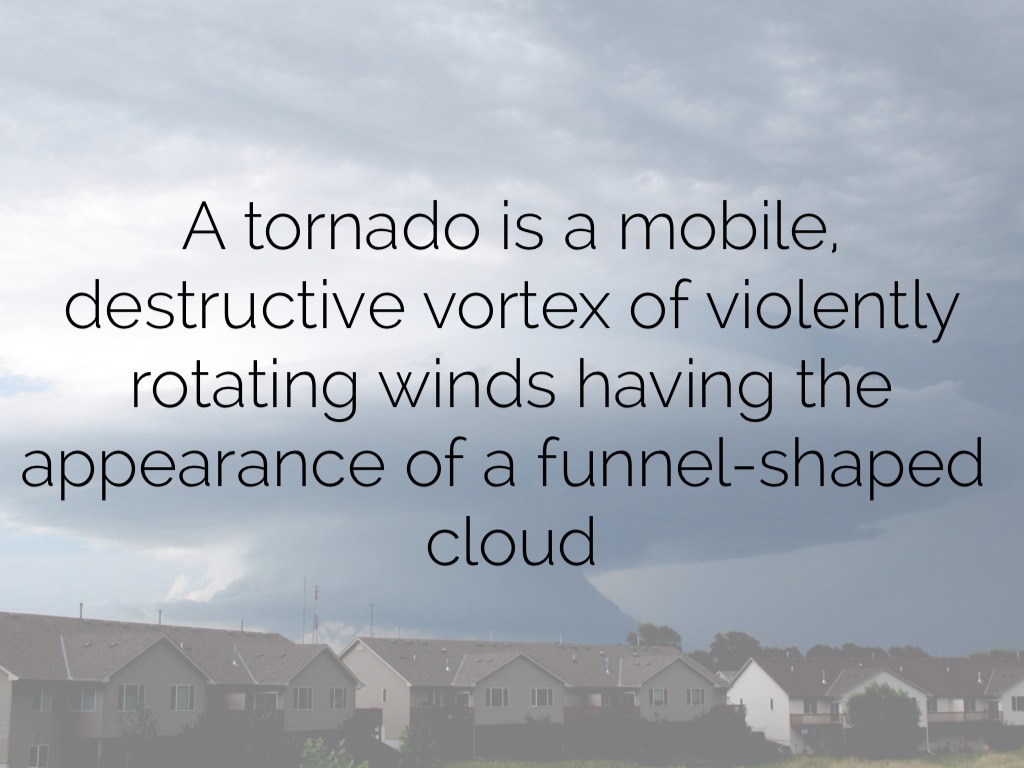 A tornado is a mobile, destructive vortex of violently rotating winds having the appearance of a funnel-shaped cloud