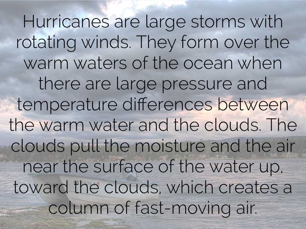 Hurricanes are large storms with rotating winds. They form over the warm waters of the ocean when there are large pressure and temperature differences between the warm water and the clouds. The clouds pull the moisture and the air near the surface of the water up, toward the clouds, which creates a column of fast-moving air.