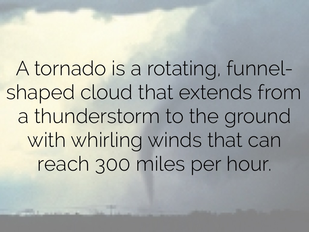 A tornado is a rotating, funnel-shaped cloud that extends from a thunderstorm to the ground with whirling winds that can reach 300 miles per hour.