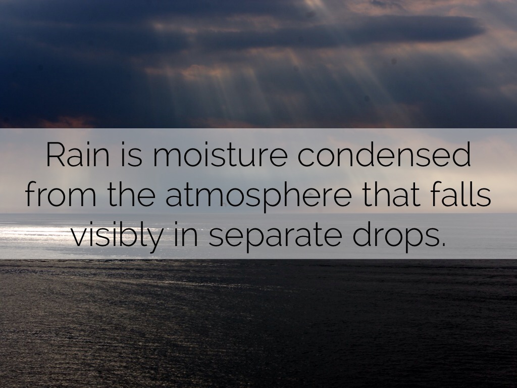 Rain is moisture condensed from the atmosphere that falls visibly in separate drops.