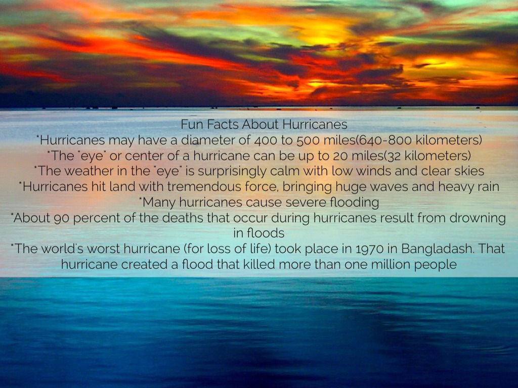 *The world's worst hurricane (for loss of life) took place in 1970 in Bangladash. That hurricane created a flood that killed more than one million people