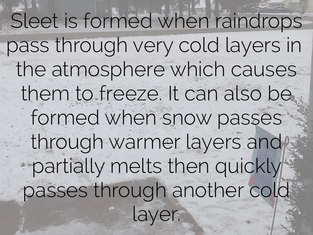 Sleet is formed when raindrops pass through very cold layers in the atmosphere which causes them to freeze. It can also be formed when snow passes through warmer layers and partially melts then quickly passes through another cold layer.