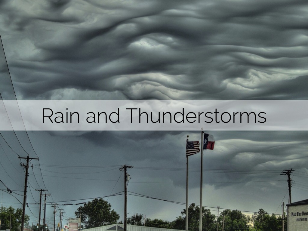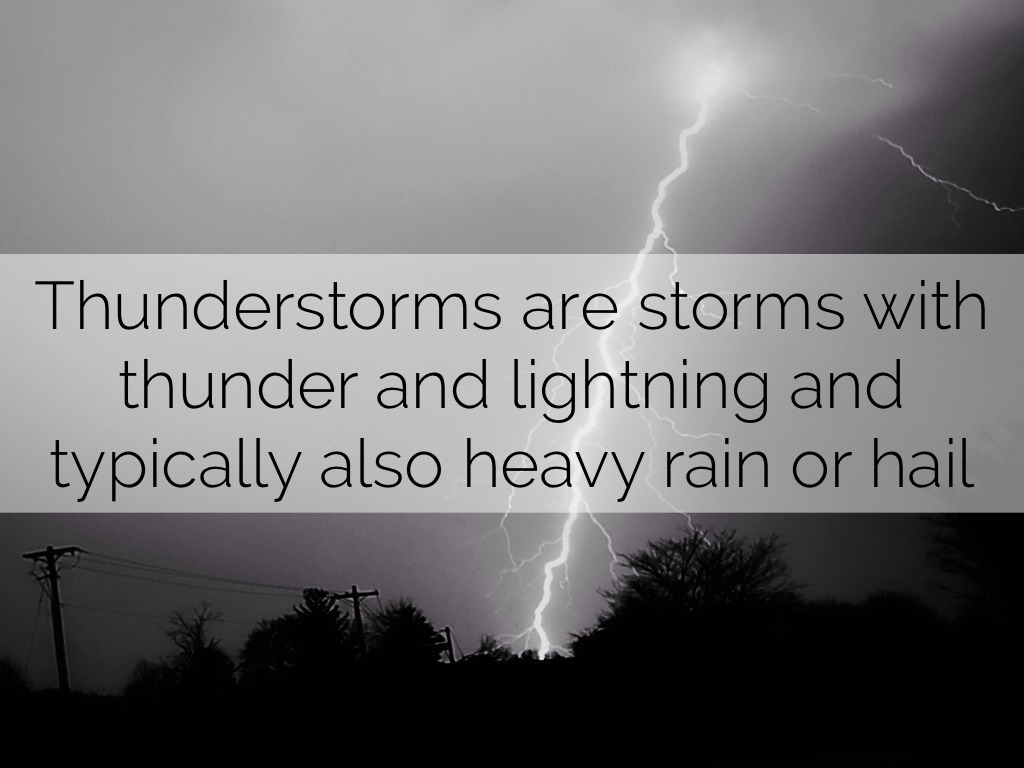 Thunderstorms are storms with thunder and lightning and typically also heavy rain or hail