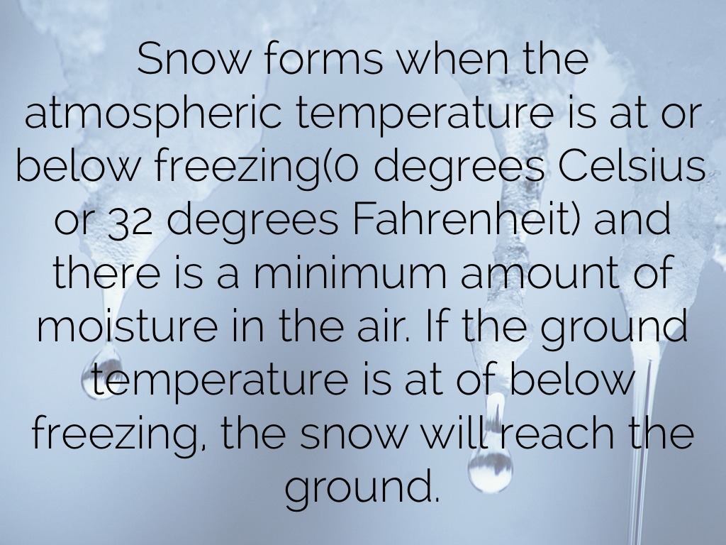Snow forms when the atmospheric temperature is at or below freezing(0 degrees Celsius or 32 degrees Fahrenheit) and there is a minimum amount of moisture in the air. If the ground temperature is at of below freezing, the snow will reach the ground.
