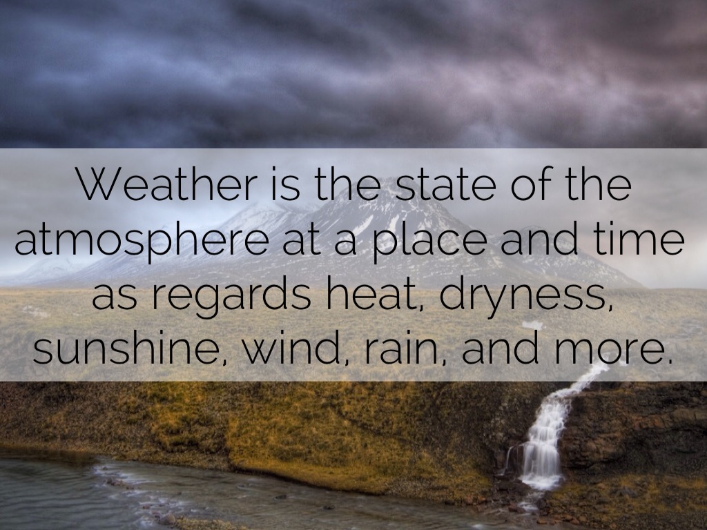 Weather is the state of the atmosphere at a place and time as regards heat, dryness, sunshine, wind, rain, and more.