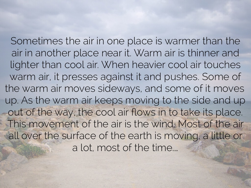 Sometimes the air in one place is warmer than the air in another place near it. Warm air is thinner and lighter than cool air. When heavier cool air touches warm air, it presses against it and pushes. Some of the warm air moves sideways, and some of it moves up. As the warm air keeps moving to the side and up out of the way, the cool air flows in to take its place. This movement of the air is the wind. Most of the air all over the surface of the earth is moving, a little or a lot, most of the time.