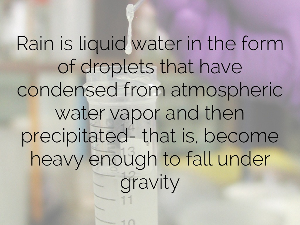 Rain is liquid water in the form of droplets that have condensed from atmospheric water vapor and then precipitated- that is, become heavy enough to fall under gravity