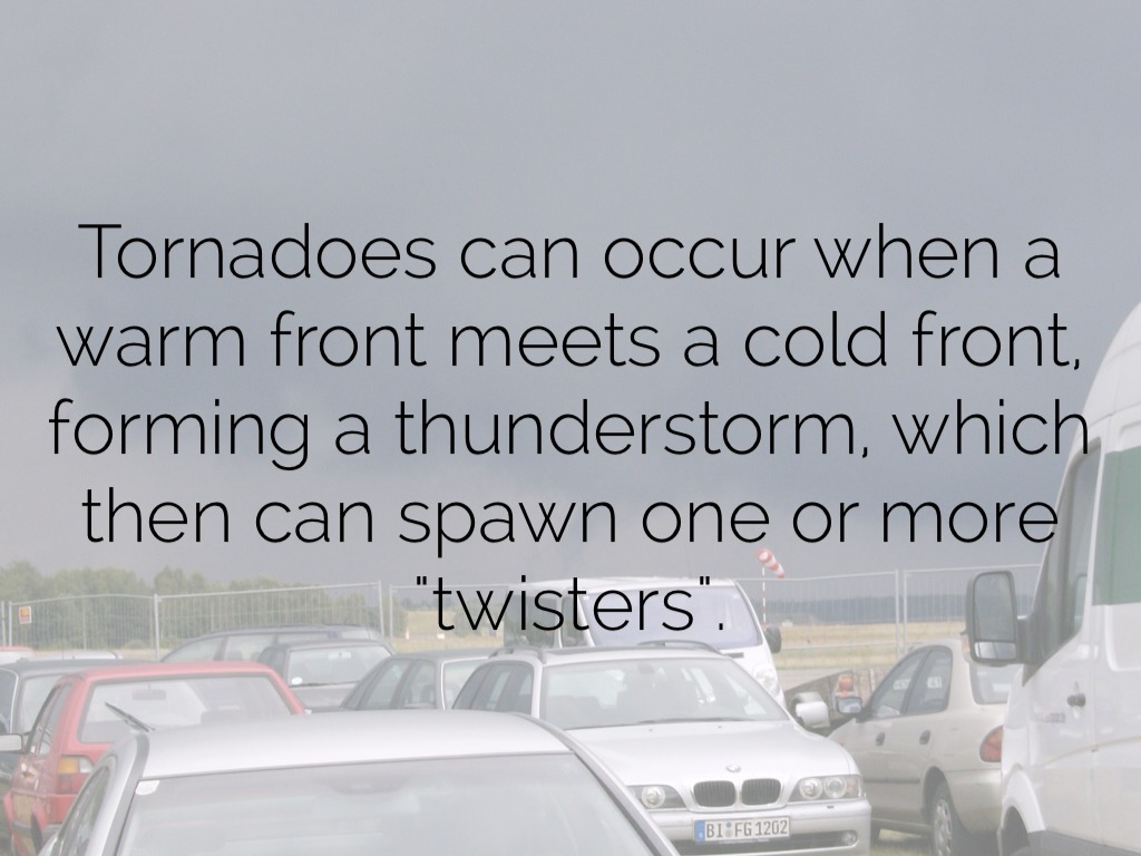 Tornadoes can occur when a warm front meets a cold front, forming a thunderstorm, which then can spawn one or more
