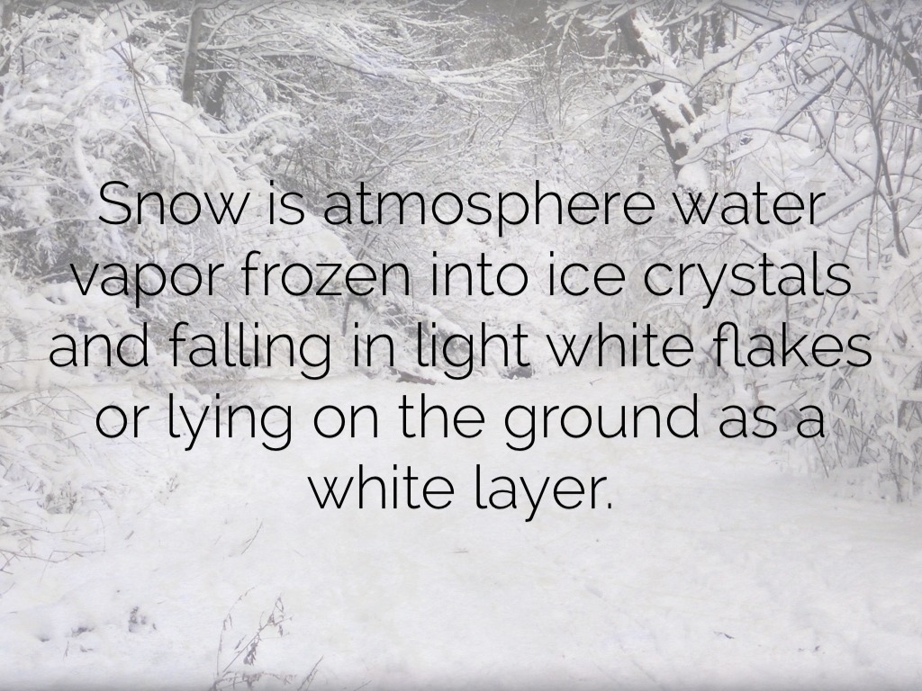 Snow is atmosphere water vapor frozen into ice crystals and falling in light white flakes or lying on the ground as a white layer.