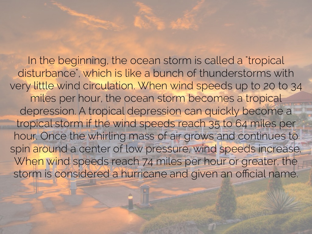 In the beginning, the ocean storm is called a "tropical disturbance", which is like a bunch of thunderstorms with very little wind circulation. When wind speeds up to 20 to 34 miles per hour, the ocean storm becomes a tropical depression. A tropical depression can quickly become a tropical storm if the wind speeds reach 35 to 64 miles per hour. Once the whirling mass of air grows and continues to spin around a center of low pressure, wind speeds increase. When wind speeds reach 74 miles per hour or greater, the storm is considered a hurricane and given an official name.