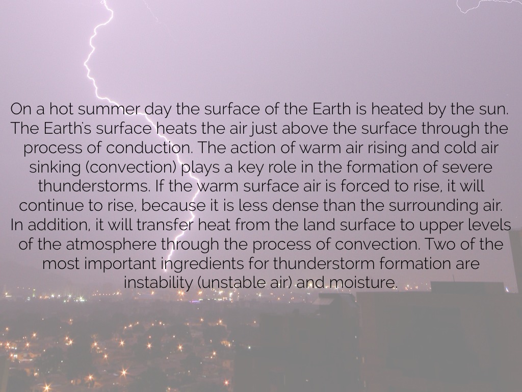 On a hot summer day the surface of the Earth is heated by the sun. The Earth's surface heats the air just above the surface through the process of conduction. The action of warm air rising and cold air sinking (convection) plays a key role in the formation of severe thunderstorms. If the warm surface air is forced to rise, it will continue to rise, because it is less dense than the surrounding air. In addition, it will transfer heat from the land surface to upper levels of the atmosphere through the process of convection. Two of the most important ingredients for thunderstorm formation are instability (unstable air) and moisture.