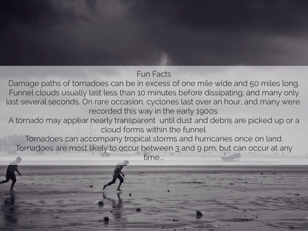 Tornadoes are most likely to occur between 3 and 9 pm, but can occur at any time.