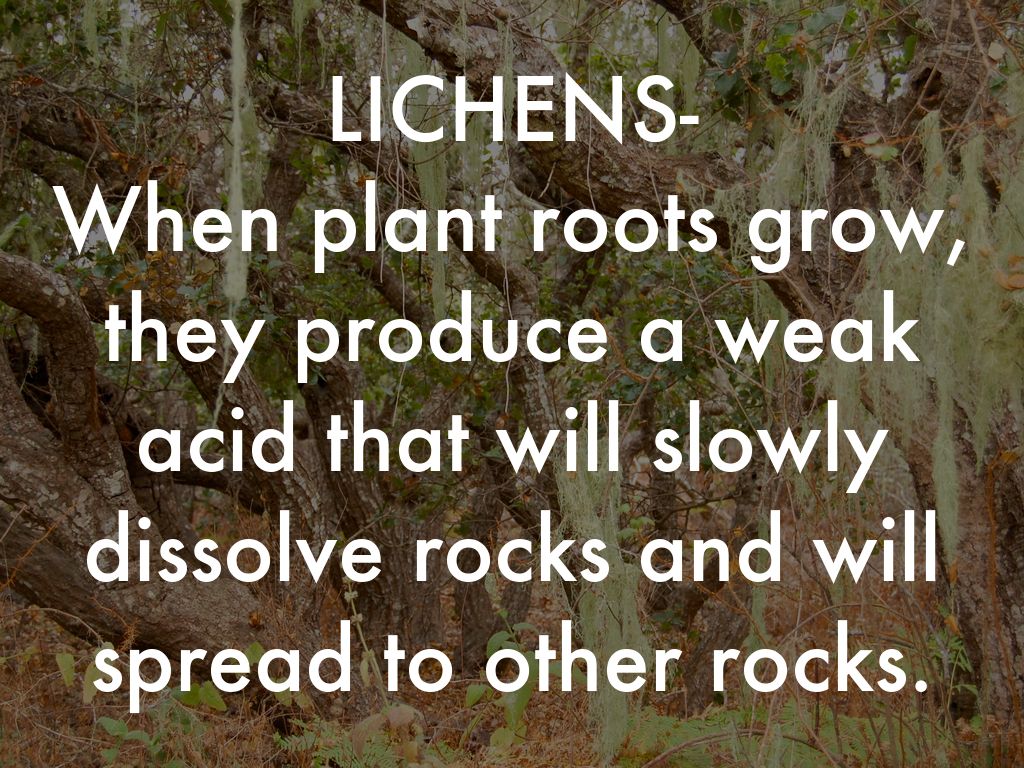 When plant roots grow, they produce a weak acid that will slowly dissolve rocks and will spread to other rocks.