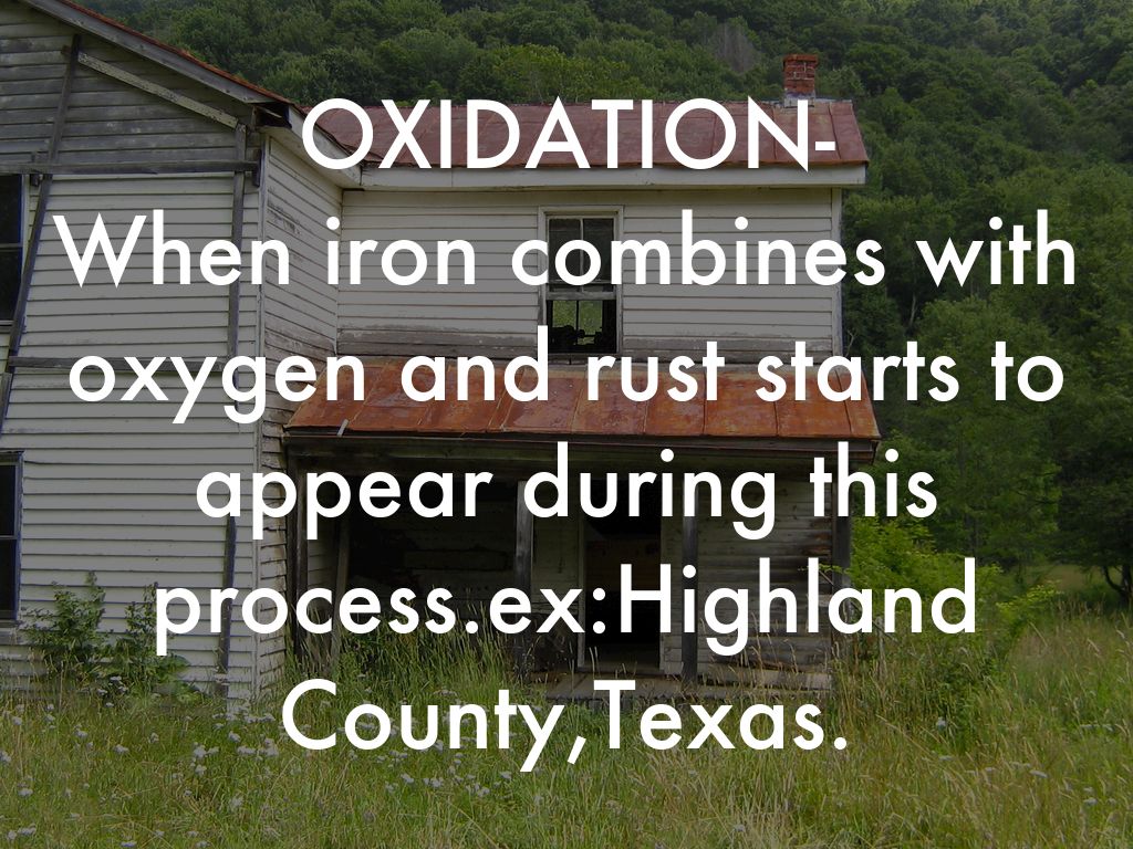 When iron combines with oxygen and rust starts to appear during this process.ex:Highland County,Texas.