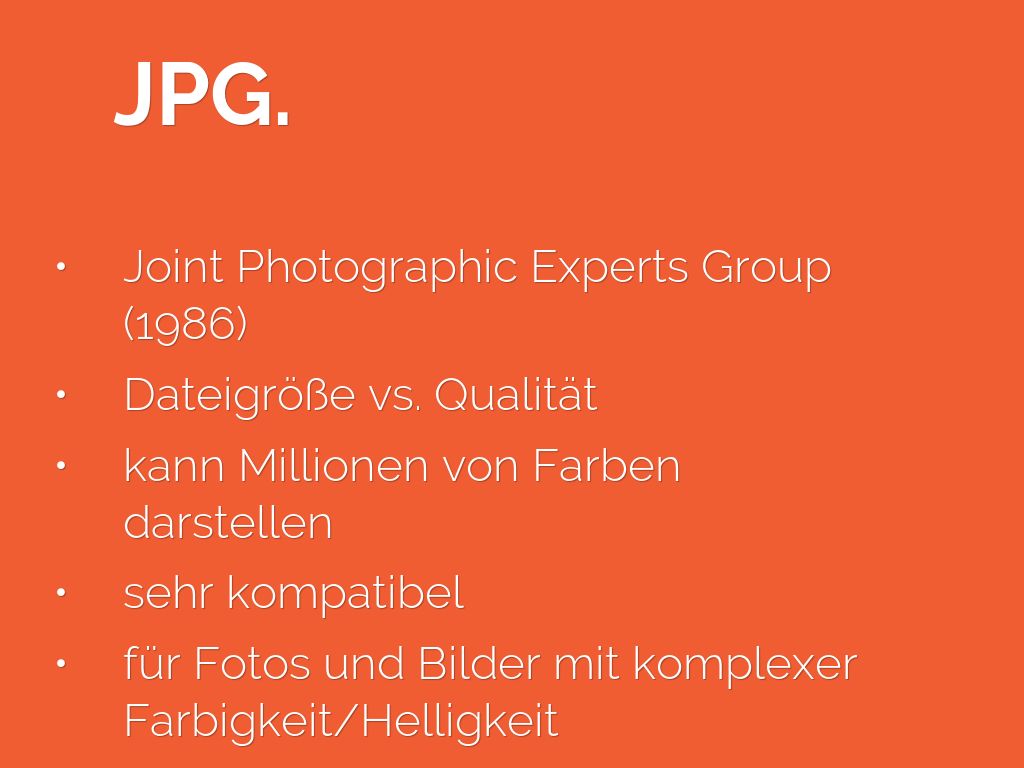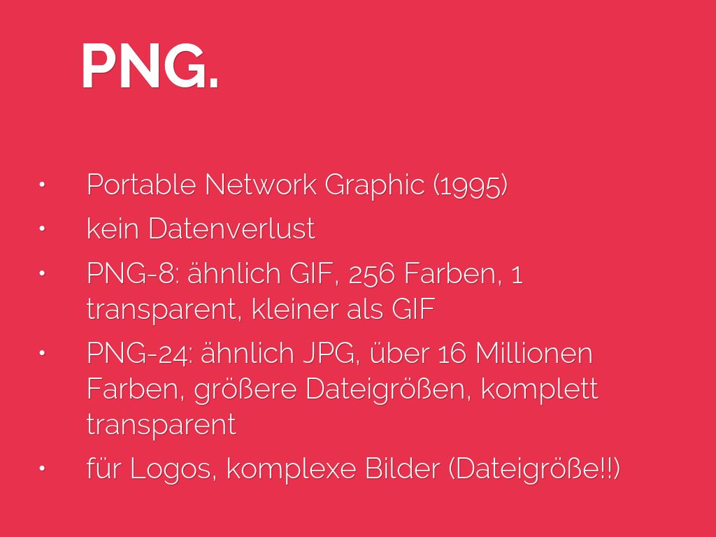 PNG-24: ähnlich JPG, über 16 Millionen Farben, größere Dateigrößen, komplett transparent