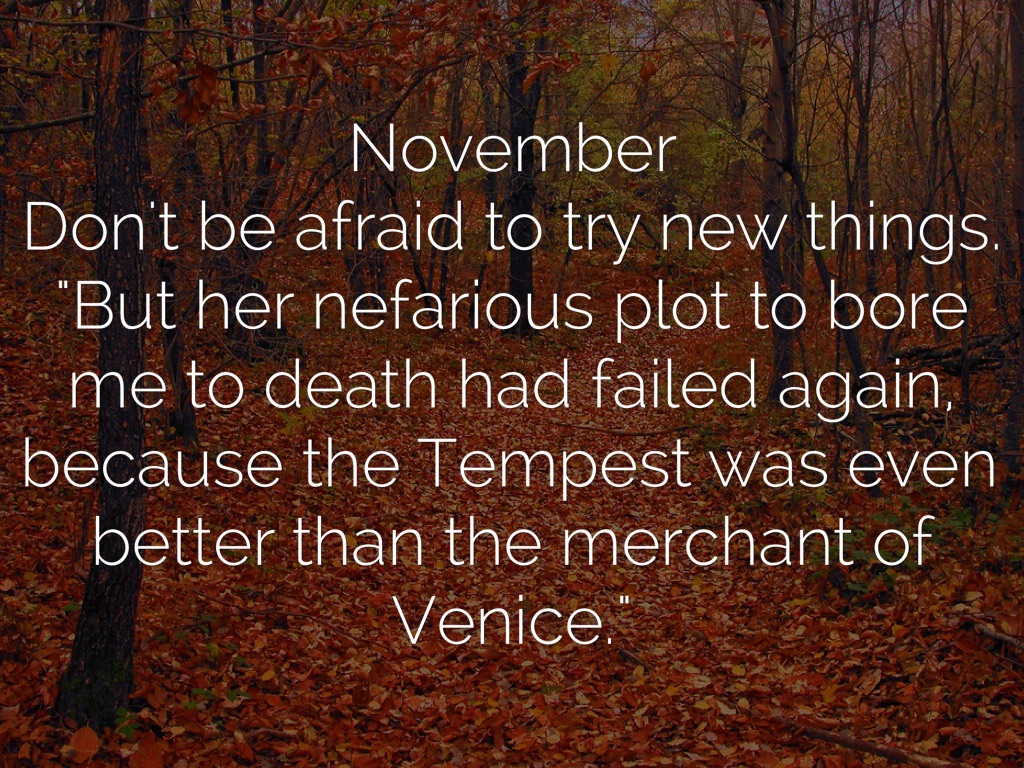 November Don't be afraid to try new things. "But her nefarious plot to bore me to death had failed again, because the Tempest was even better than the merchant of Venice."