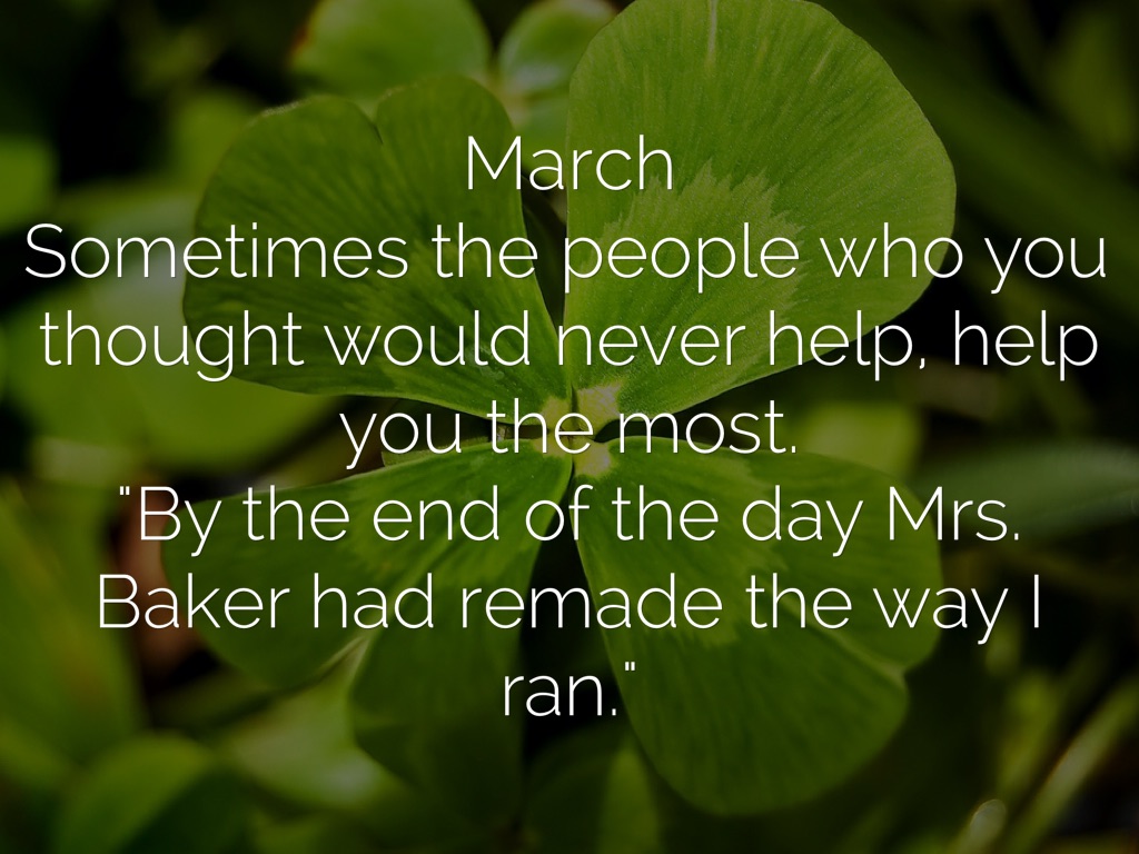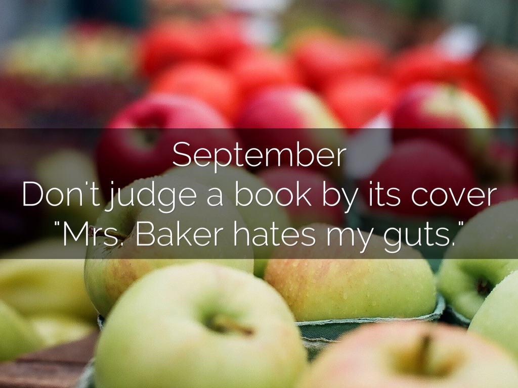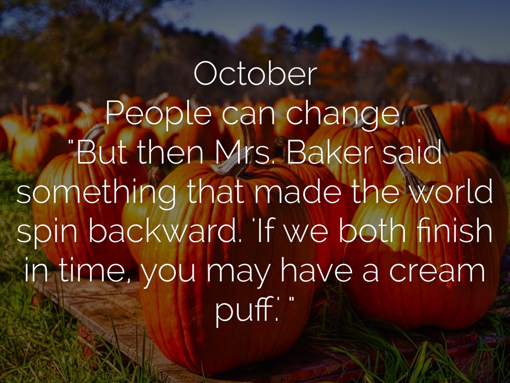 October People can change. "But then Mrs. Baker said something that made the world spin backward. 'If we both finish in time, you may have a cream puff.' "
