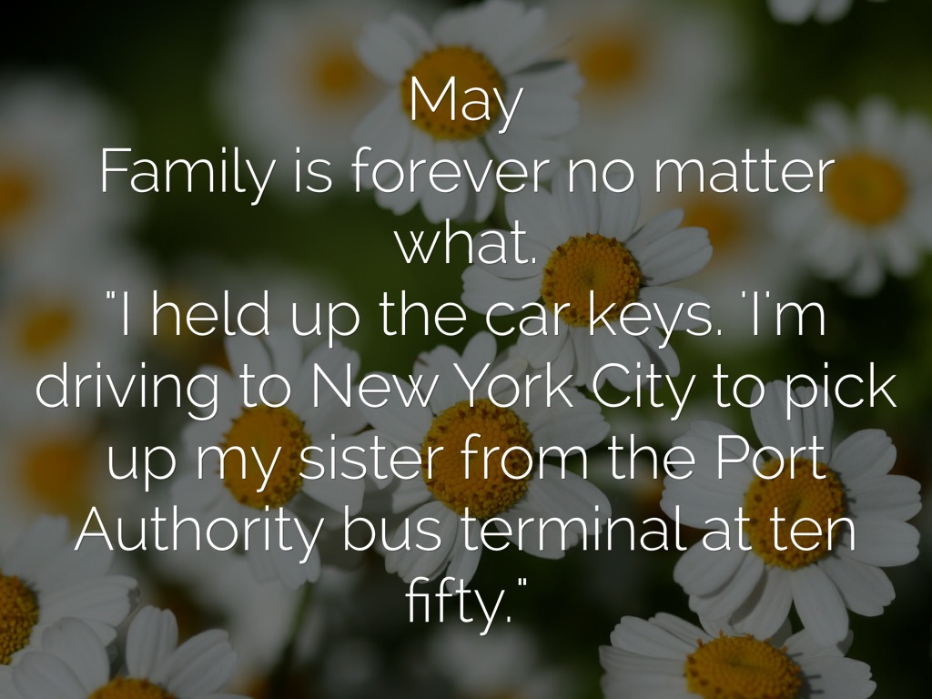 May Family is forever no matter what. "I held up the car keys. 'I'm driving to New York City to pick up my sister from the Port Authority bus terminal at ten fifty."