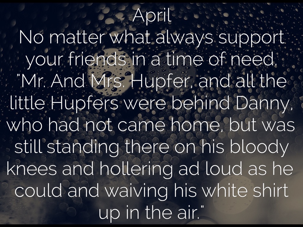 April No matter what always support your friends in a time of need. "Mr. And Mrs. Hupfer, and all the little Hupfers were behind Danny, who had not came home, but was still standing there on his bloody knees and hollering ad loud as he could and waiving his white shirt up in the air."