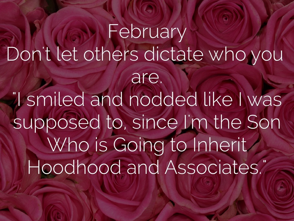 February Don't let others dictate who you are. "I smiled and nodded like I was supposed to, since I'm the Son Who is Going to Inherit Hoodhood and Associates."